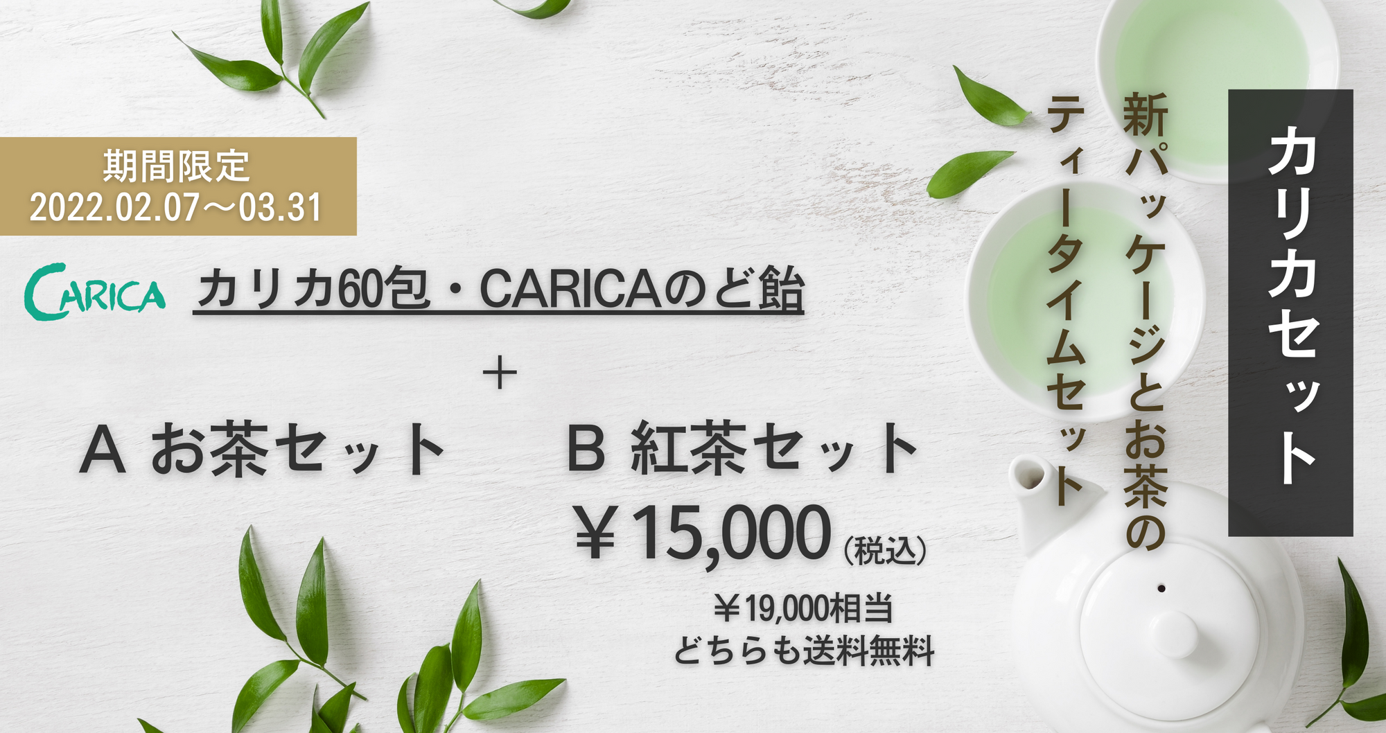 メーカーだけのオリジナルパッケージ『カリカセラピ60包』と新しくリニューアルされた『CARICAのど飴』にご好評の掛川茶(深蒸し茶 又は 紅茶)をセットで販売いたします。さわやかなエメラルドグリーンのパッケージセットはいかがですか?
