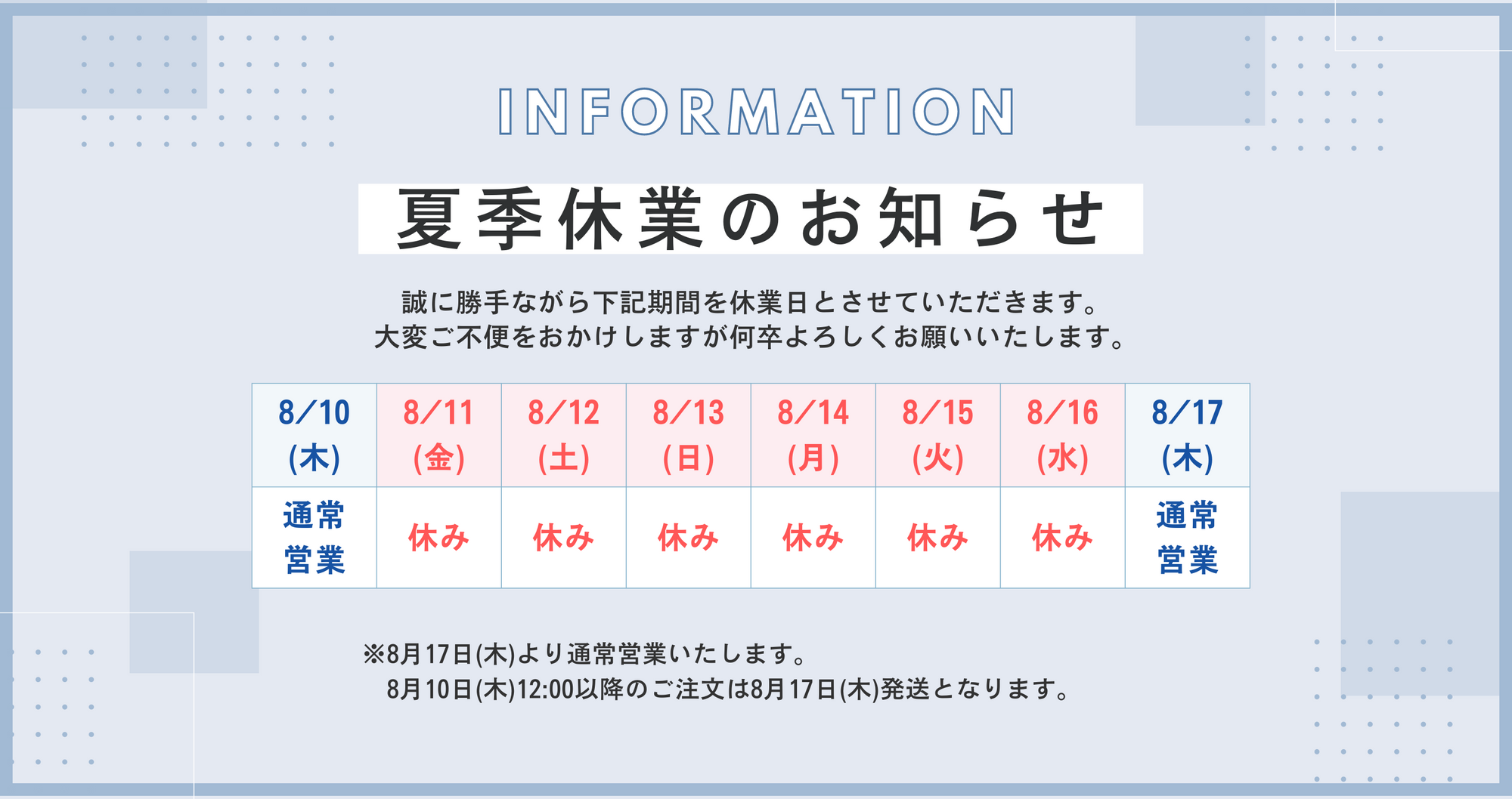 夏季休業期間:2023年8月11日(金)~8月16日(水)