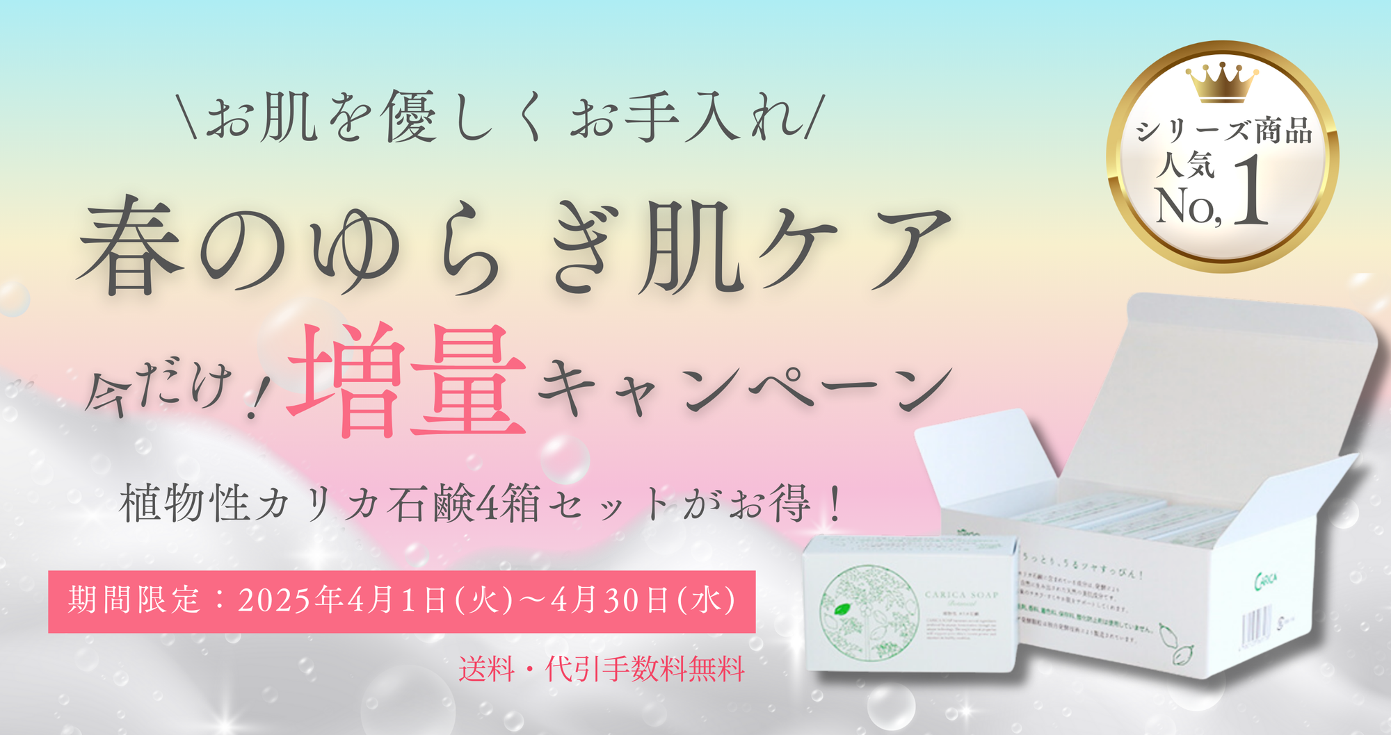 春の訪れとともに、肌が敏感になりやすい季節がやってきました。花粉や紫外線、気温の変化などによるダメージから肌を守るために、石鹸増量キャンペーンを実施いたします。