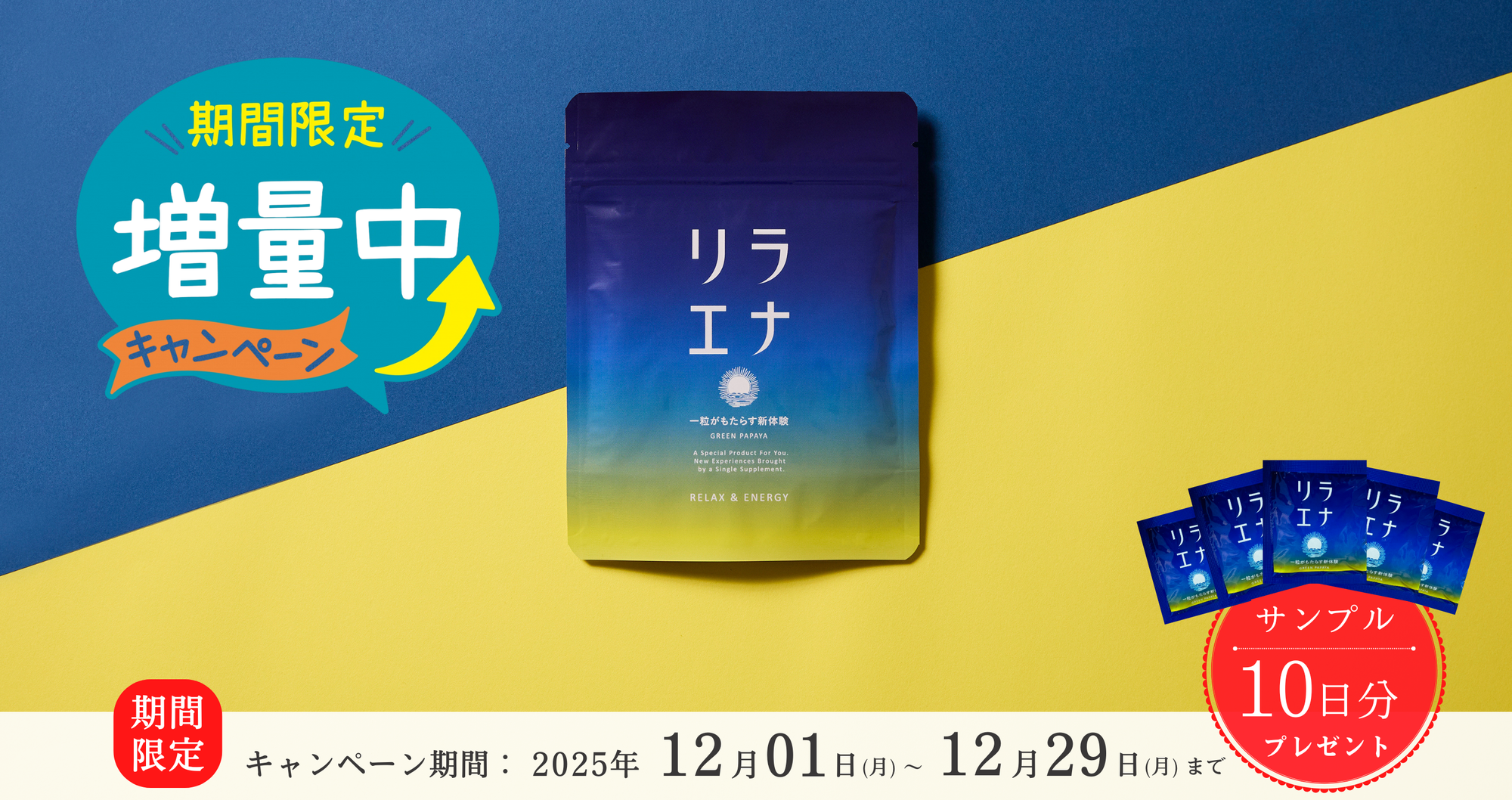 【キャンペーン内容】期間中、リラエナ90粒入り(単品・定期便どちらも対象)をお求めいただきますと10日分増量プレゼント!※定期便につきましては初回のみ増量となります。
