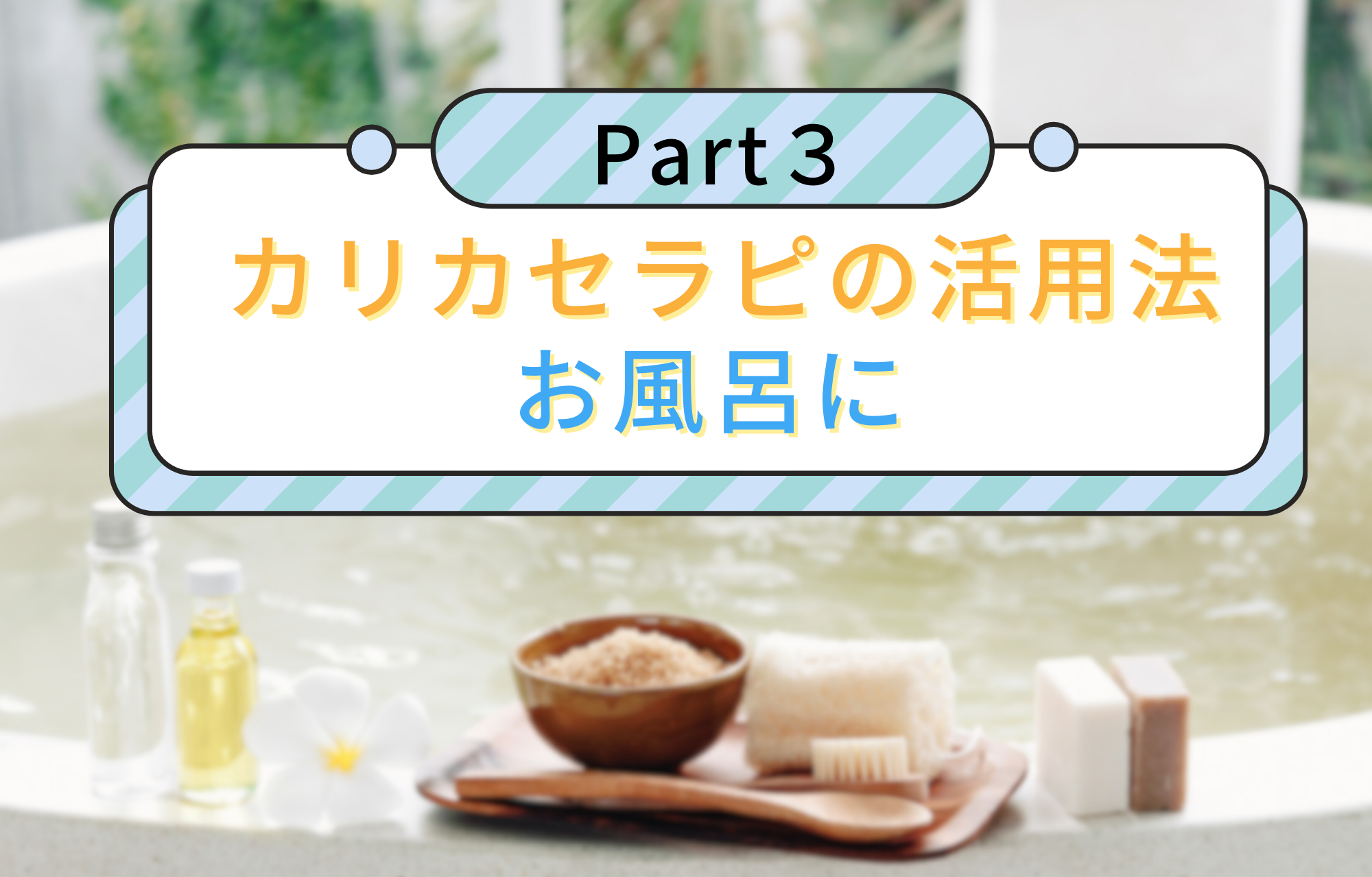 カリカセラピを1~2包湯船に入れ、よく混ぜてから入浴されてください。お湯の肌触りがやわらかくなり、お肌もしっとり仕上がります。